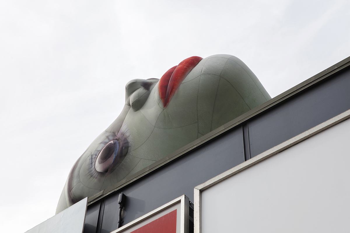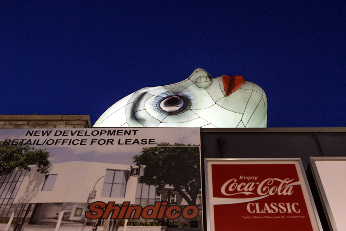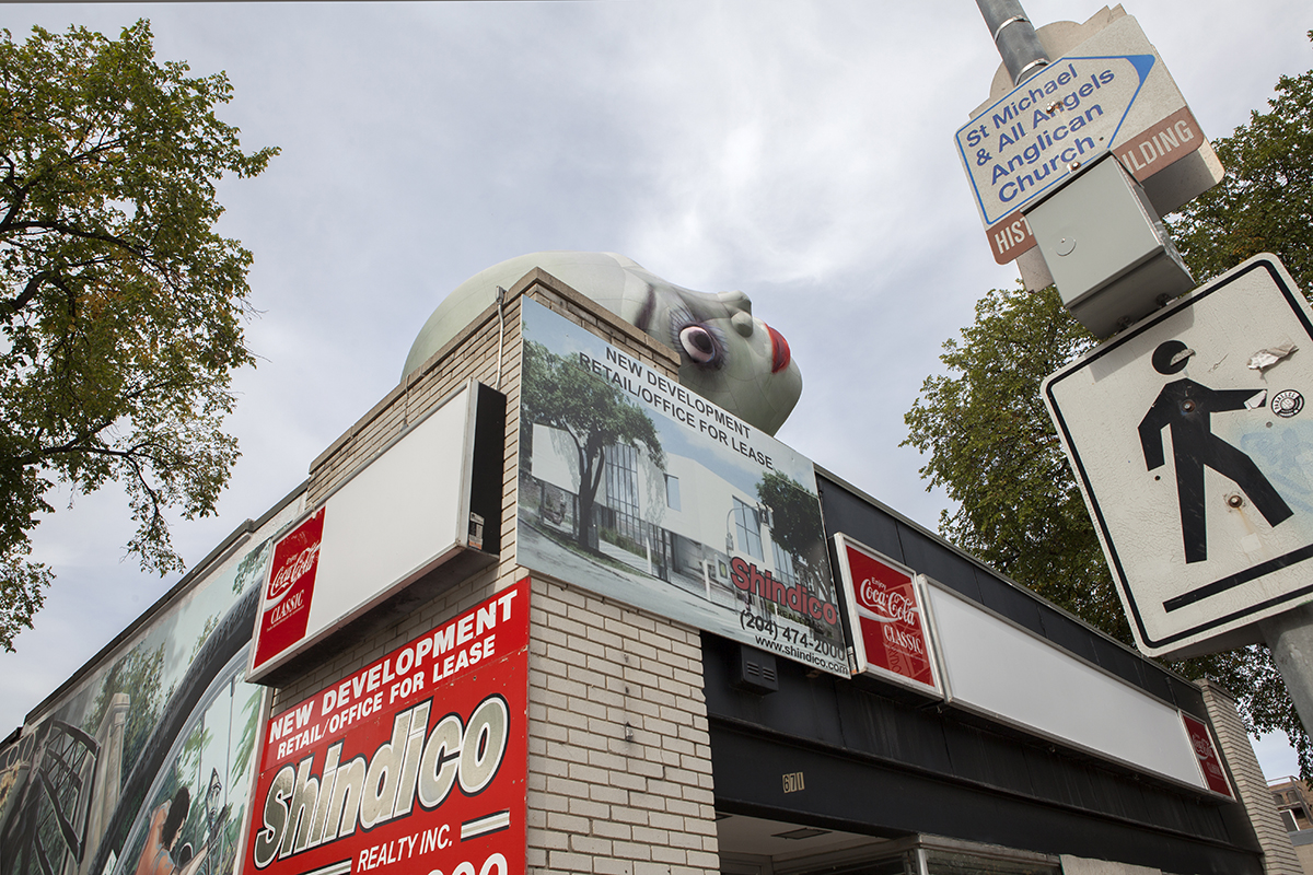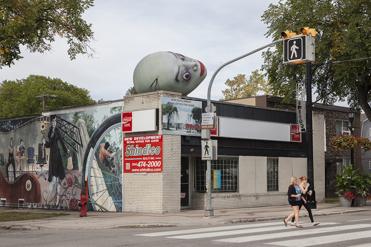 Erica Eyres’ artwork is influenced by the social and artistic milieu of Winnipeg, where she was born and regularly returns from her current home in Glasgow. She embraces awkwardness and humour through episodic work which often has a lo-fi craft aesthetic. Her biography is frequently the subject of her work, which she obscures through costuming, narration and role reversals. For STAGES she has disembodied and blown up a head into an inflatable sculpture that she has placed outside on top of a small commercial building. The head hauntingly yet pathetically is tipped on its side, severed from its body, tied to the roof of an abandoned building, which is destined for demolition. Head is set hovering from above, perched on the corner of a busy street; it is both starling and comical. For those passing by, there is a possible double-take. The inflatable has the implied connotation of an advertising gimmick, but something isn’t right. The eyes are off center, the nose flattened and the mouth pursed, and the building below is vacant with the sign covered in white vinyl. The head just looms.