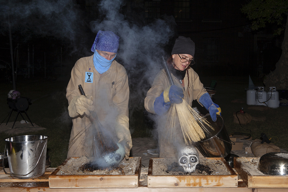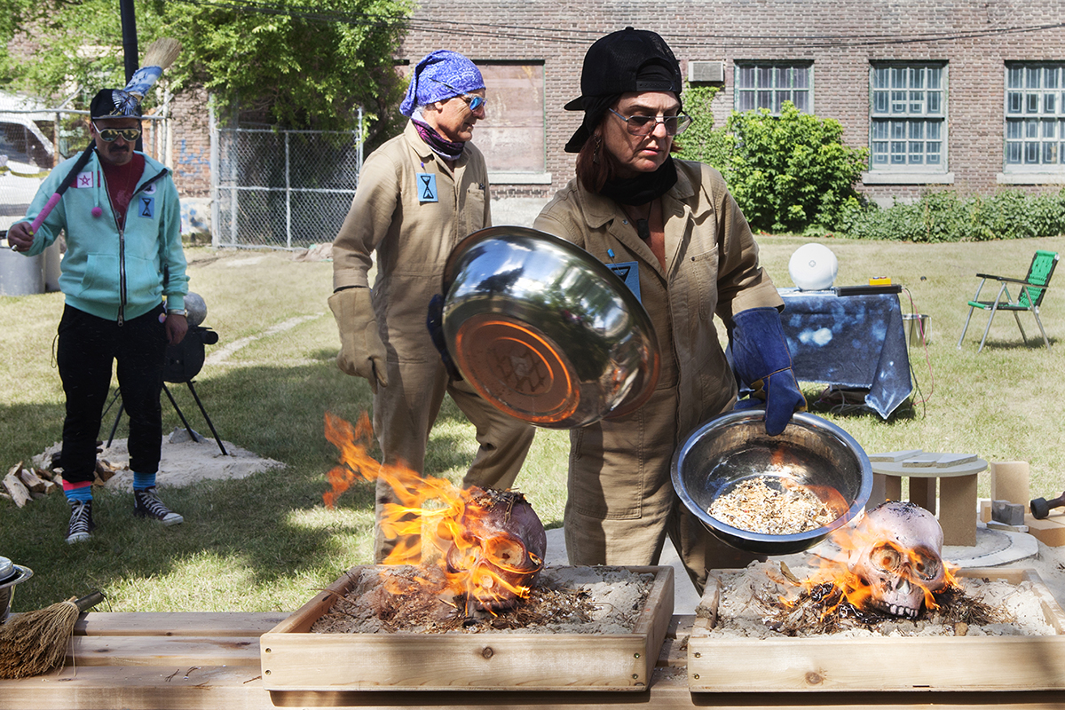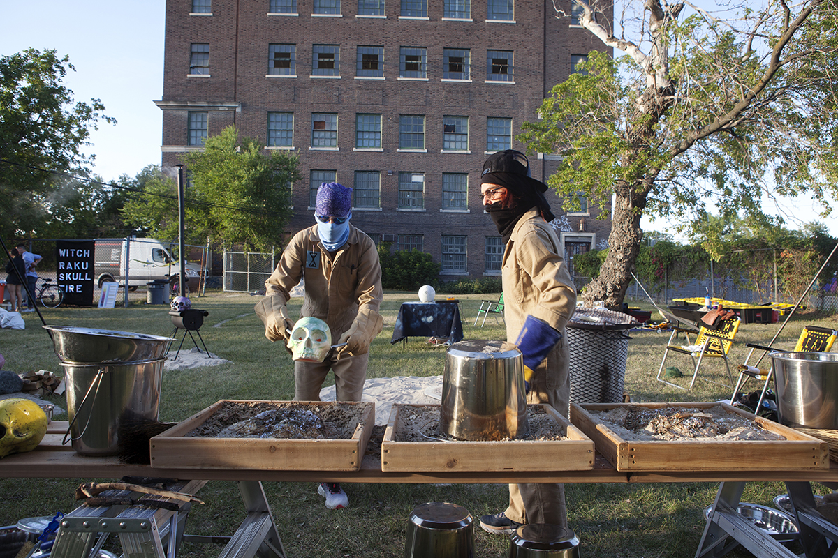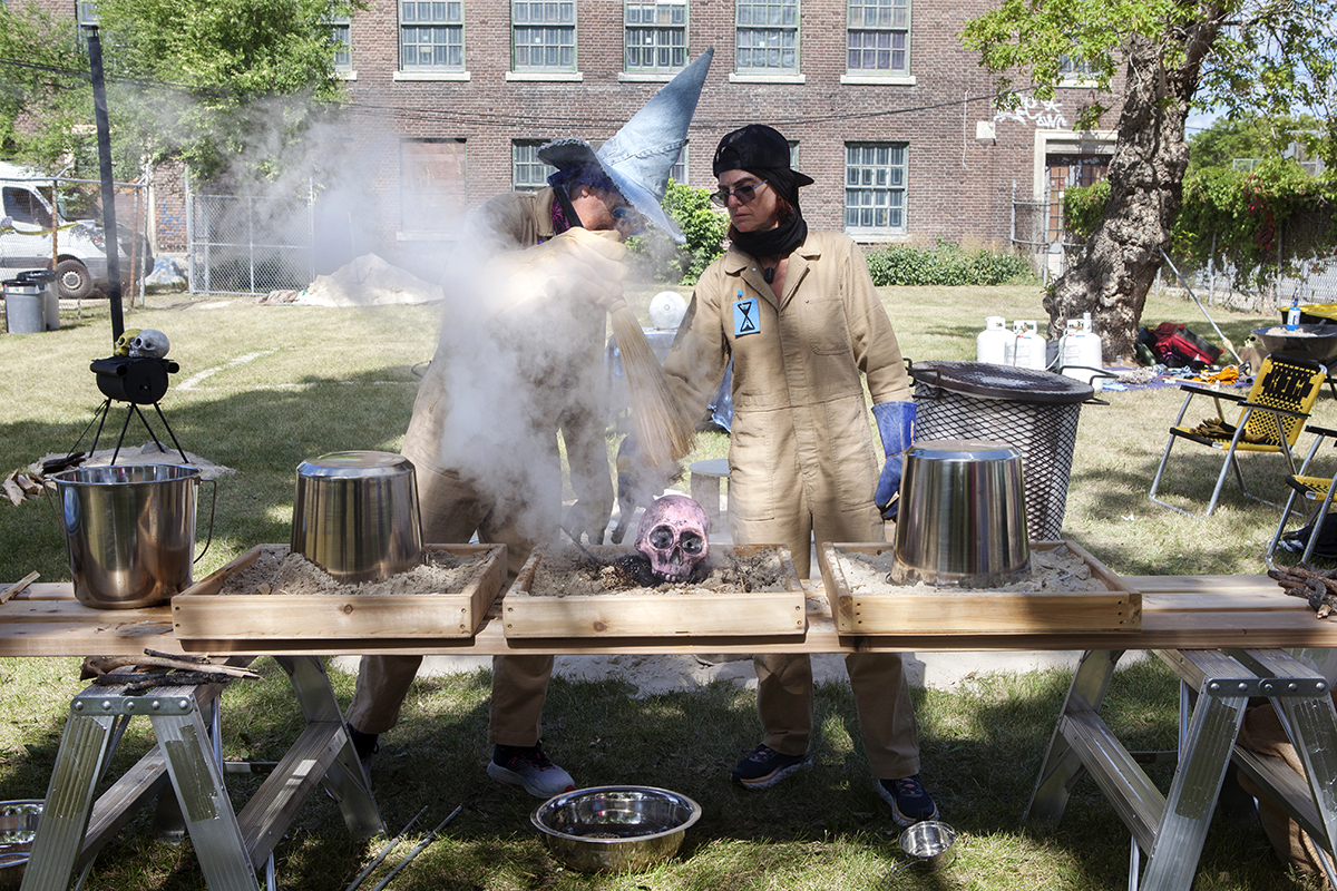 For STAGES, FASTWÜRMS have choreographed a performance #witch_raku_skull_fire located in an old warehouse, bordering railway tracks and nestled on the industrial edge of downtown Winnipeg before the residential neighbourhood of Point Douglas. The site’s liminal position as close to the centre and on the cusp of residential land has an unclaimed, albeit contained, feral quality that is studied by the artist duo. They will use what was once a domesticated site occupied by several small working-class houses, turned brothels, before being subsumed by the commercial production site and warehouse of the neighbouring JR Watkins Company. The Company demolished the houses, cultivating a yard for its employees that has now long remained in various states of care as the building and site moved from various ownerships through the 20th and now 21st century. In imagining this land shifting back into an uncultivated, unindustrialized and decolonized space, FASTWÜRMS will host a durational performance from noon until midnight on August 22nd, creating a ‘camp’ spectacle with “C.A.T. cops”, a steaming caldron and the live theatrical firing of ceramic skulls. Their ritualization of the process of firing ceramics consecrates labour, by ‘ghosting’ the presence of absence and conjuring the politics of the colony and plantation.