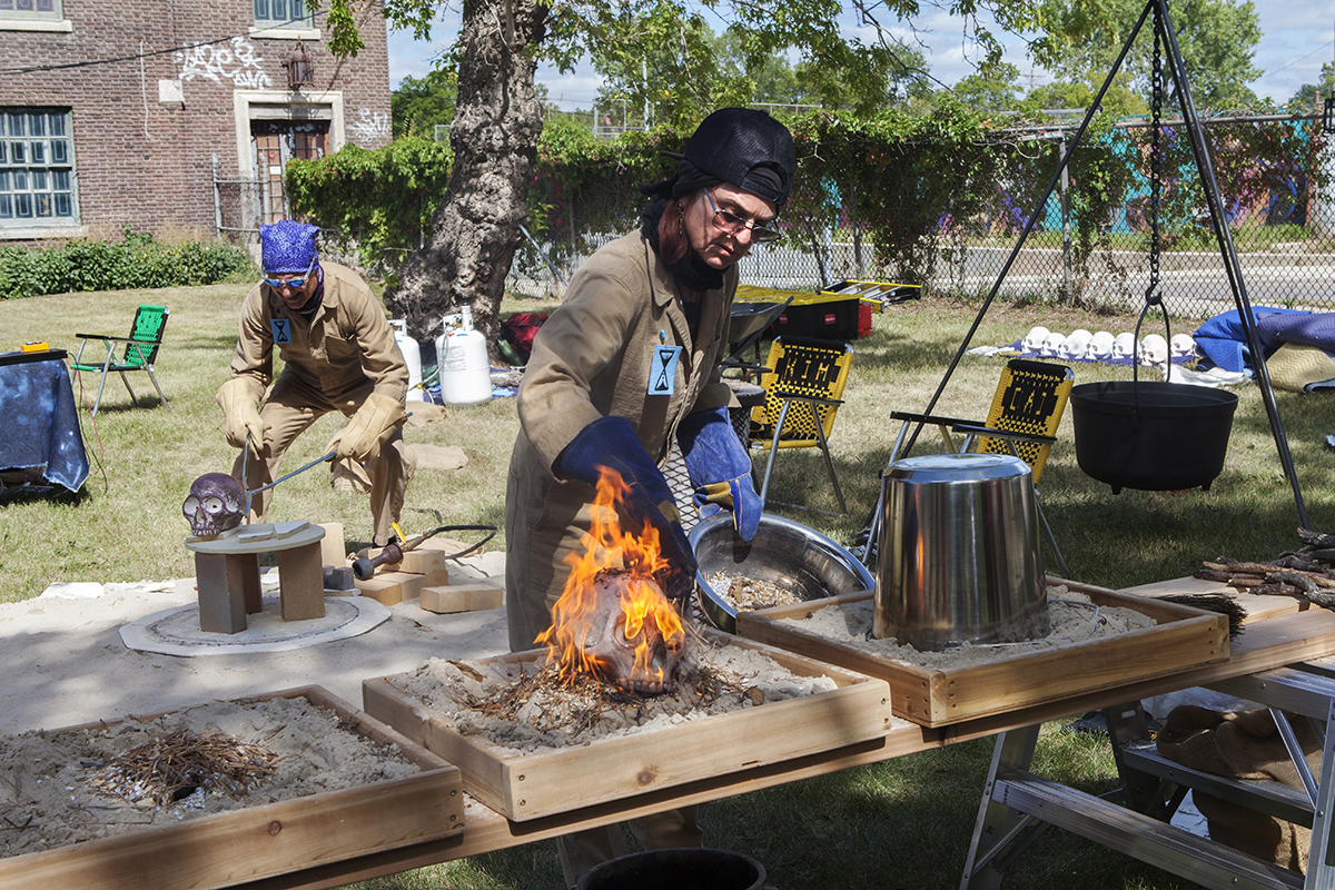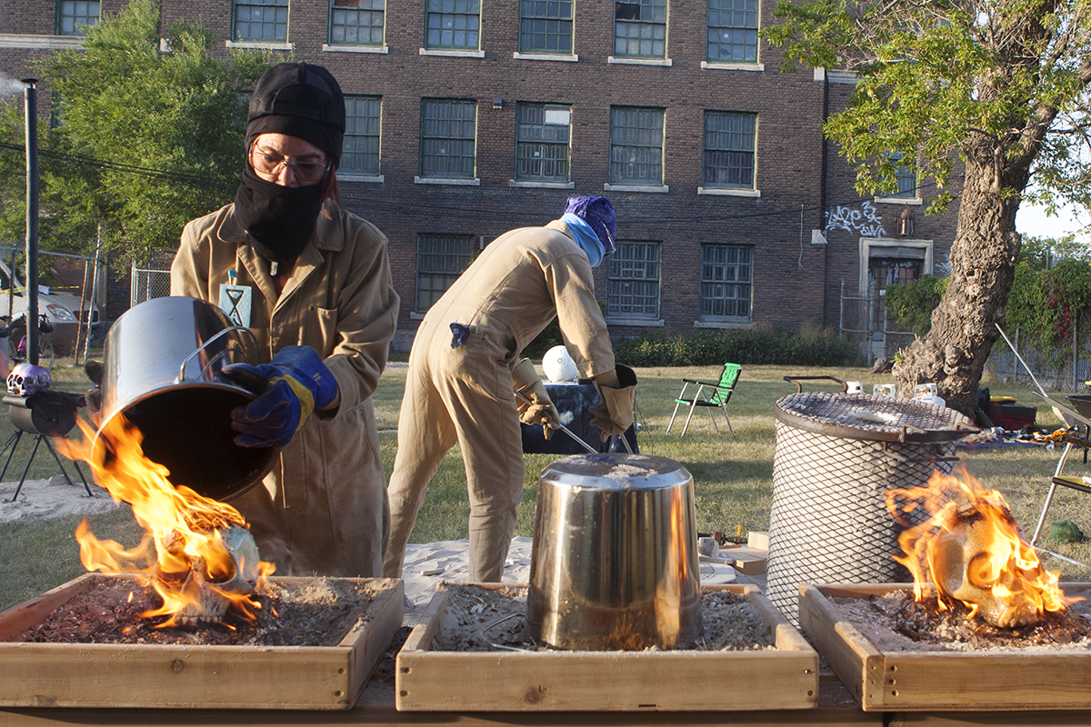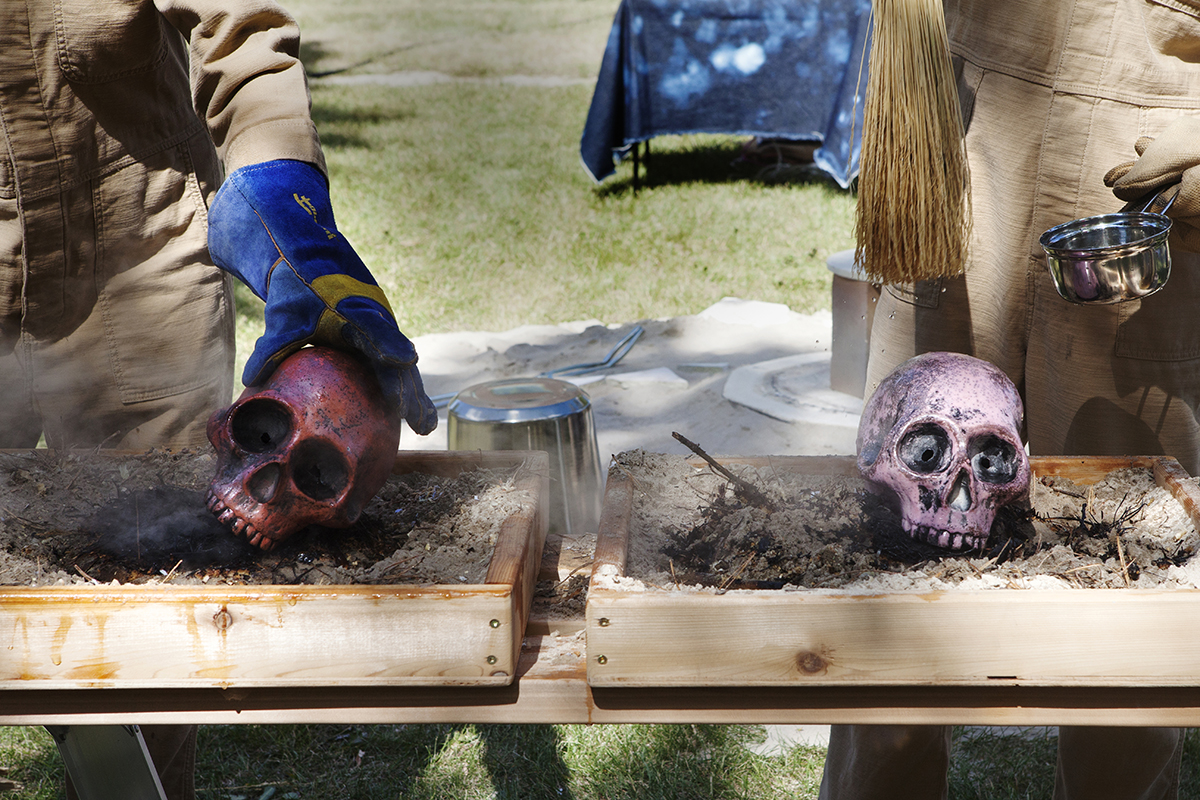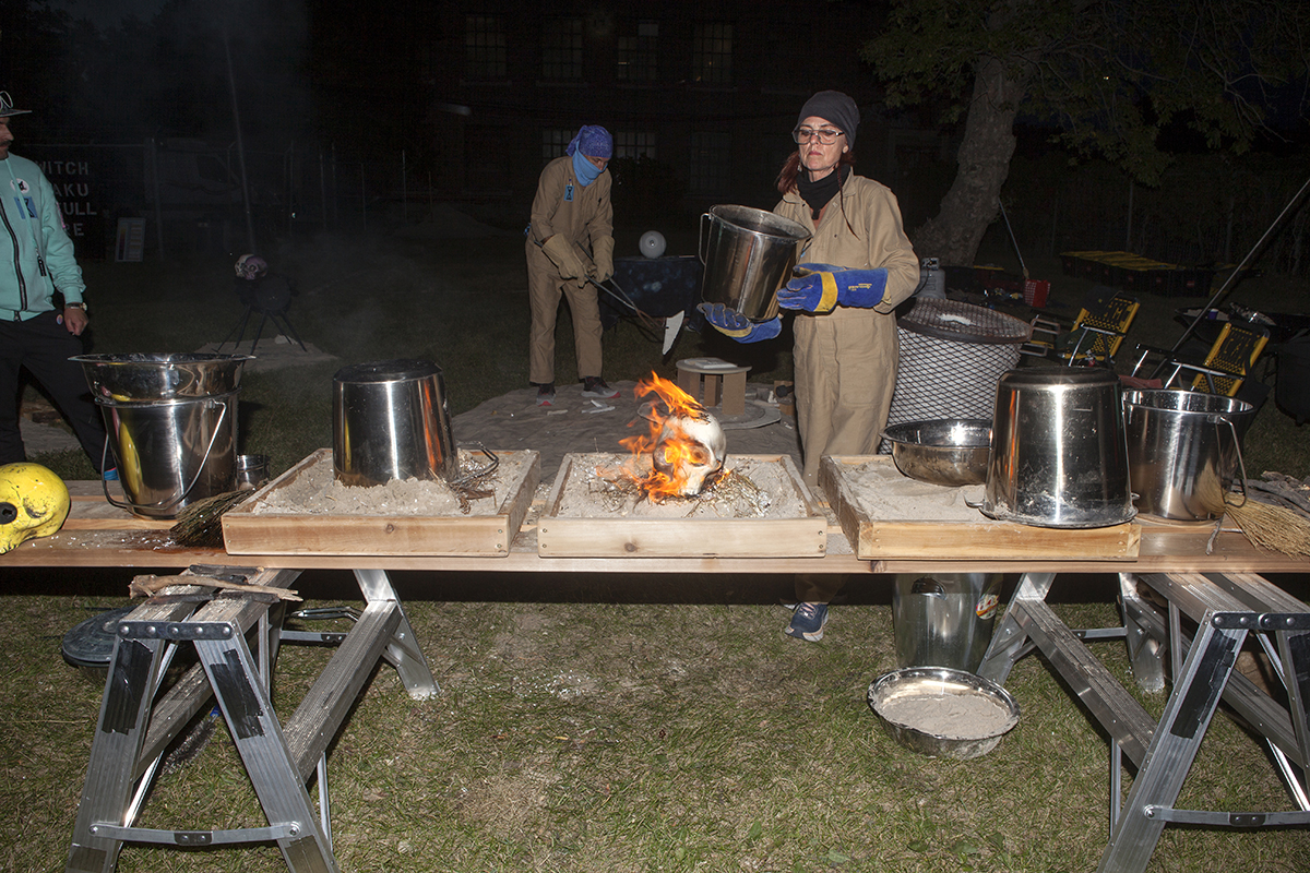 For STAGES, FASTWÜRMS have choreographed a performance #witch_raku_skull_fire located in an old warehouse, bordering railway tracks and nestled on the industrial edge of downtown Winnipeg before the residential neighbourhood of Point Douglas. The site’s liminal position as close to the centre and on the cusp of residential land has an unclaimed, albeit contained, feral quality that is studied by the artist duo. They will use what was once a domesticated site occupied by several small working-class houses, turned brothels, before being subsumed by the commercial production site and warehouse of the neighbouring JR Watkins Company. The Company demolished the houses, cultivating a yard for its employees that has now long remained in various states of care as the building and site moved from various ownerships through the 20th and now 21st century. In imagining this land shifting back into an uncultivated, unindustrialized and decolonized space, FASTWÜRMS will host a durational performance from noon until midnight on August 22nd, creating a ‘camp’ spectacle with “C.A.T. cops”, a steaming caldron and the live theatrical firing of ceramic skulls. Their ritualization of the process of firing ceramics consecrates labour, by ‘ghosting’ the presence of absence and conjuring the politics of the colony and plantation.
