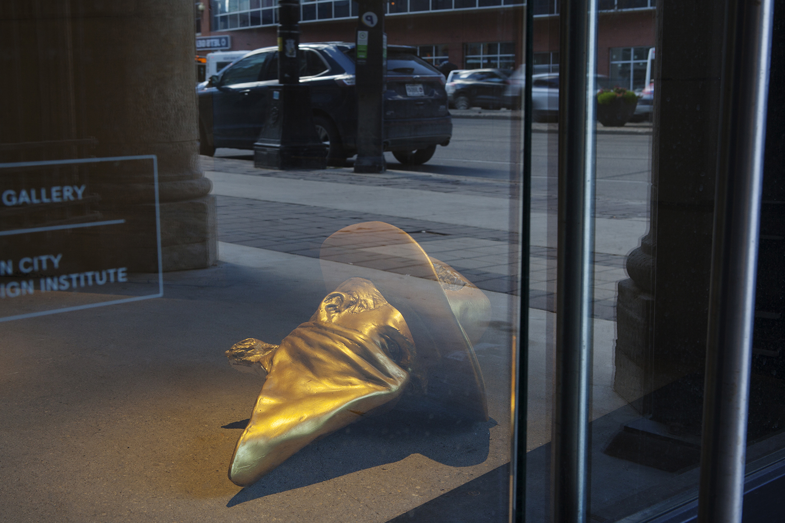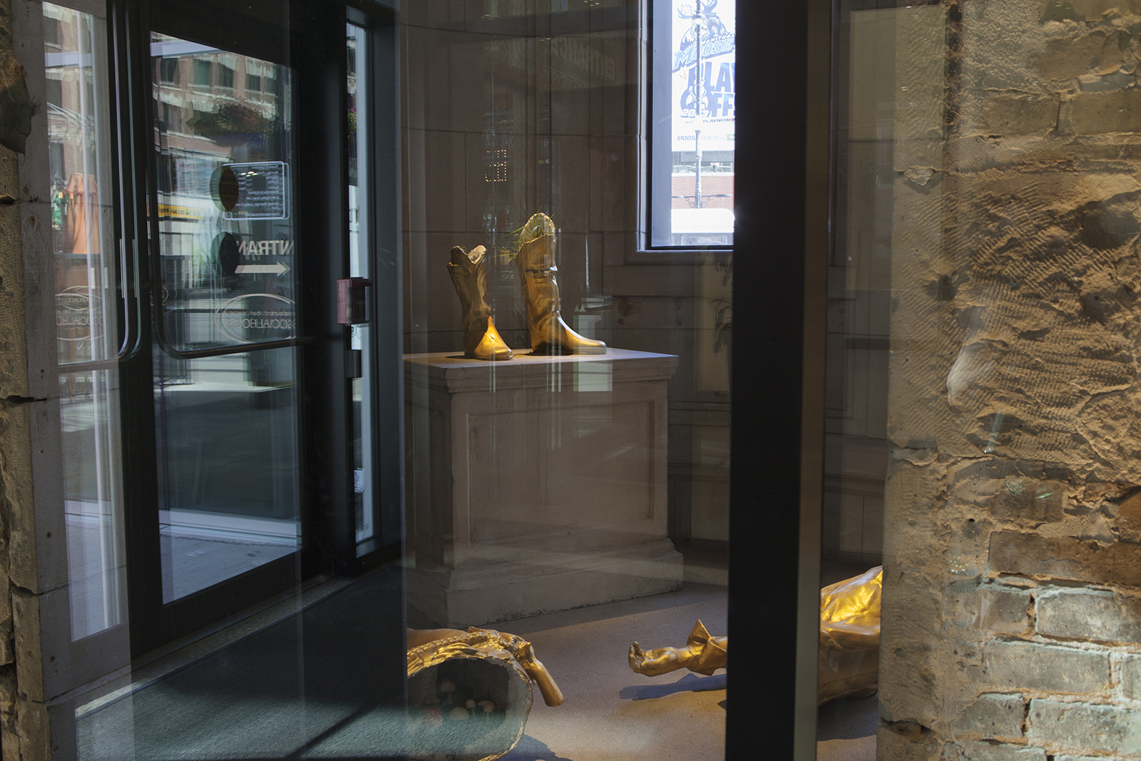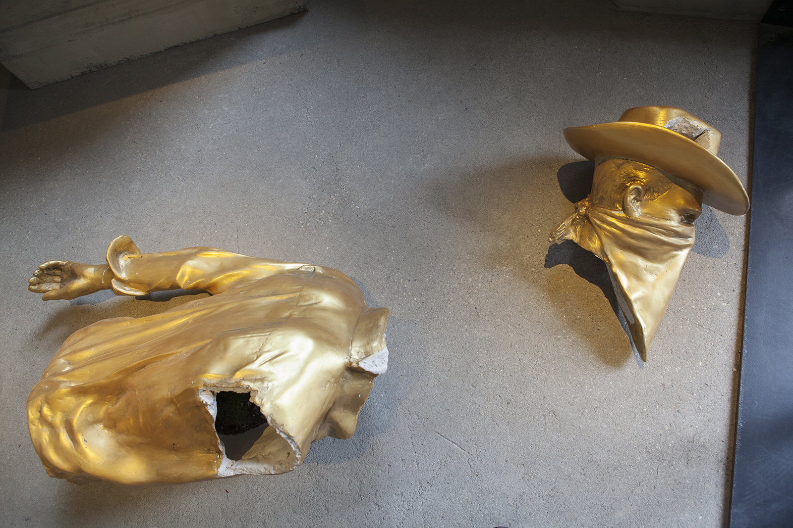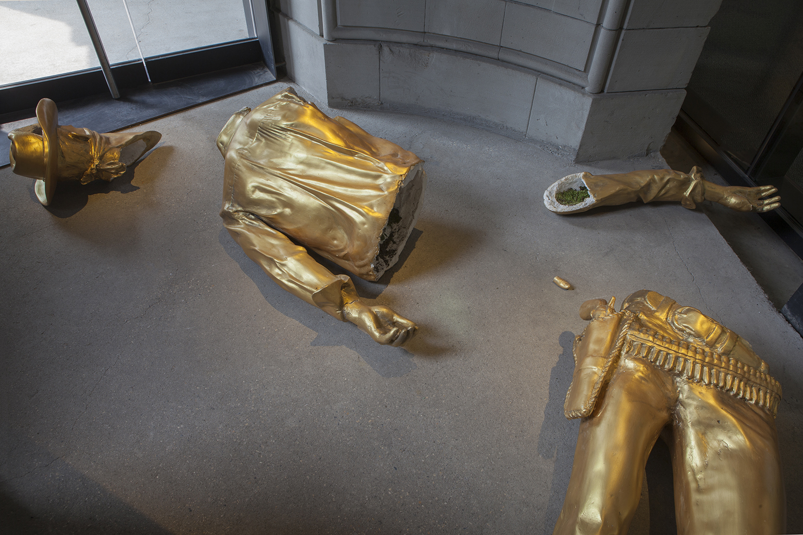 Zacharias’s Toppled Monument is a literal interpretation of the Hollywood, white supremacist ideology of the aggrandized and sometimes deified cowboy. As a boy, he grew up with the saturated, celluloid image of the cowboy unilaterally going through ‘the west’ using the troupe of the ‘white saviour’ to make the uncontrollable brown swaths of folks fall into line or endearing the notion of embedded criminality that has to be stomped out by the rule-abiding cowboy and all that he signifies. Making women submit to the strong, wise, powerful man that can ensure protection from the unknown ‘darkness’ her submission is the complicity of protecting her cowboy. His harkening of the plundering done in the name of righteous ownership is reflected in the gleaming gold wrapping of the work.